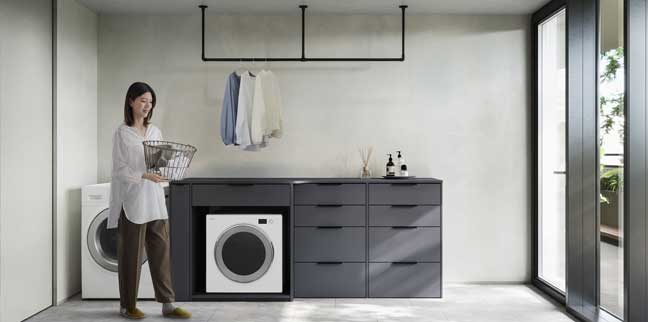 洗濯家事の「洗う、乾かす(干す)、たたむ(整える)、しまう」を1カ所に集約して、毎日の家事をグッと効率的に。時間と手間を節約して、家族との時間を増やすランドリールーム専用の収納です。