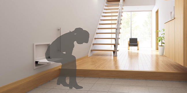 壁面に収納可能な開閉式のベンチ。玄関に取り付け、腰を掛けて靴の脱ぎ履きができるので便利です。