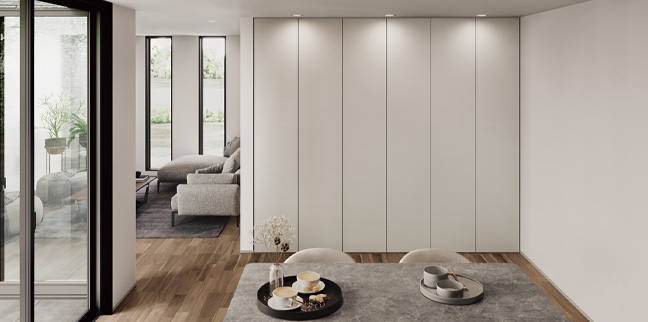 ノイズレスな連続開き戸と収納棚。まるで壁の一部のように空間に溶け込み、インテリアに美しく調和します。