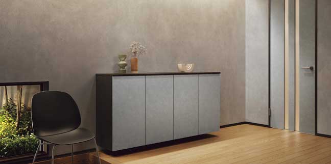 「石目調」「レザー調」「金属調」「モルタル調」の選び抜かれた素材が、異素材と品よく調和し、微細な表情とゆらぎを生み出します。優雅な余韻と時を超える品格を感じさせるシリーズです。