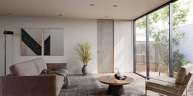 存在感のあるブラック色が空間を引き締め、高級感を演出。調整ストライク、アルミチャンネル、吊り戸レールの3つの「ブラック」でさらに充実した『ブラックフレームインテリア』