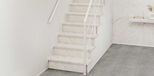 シンプルな単色柄の階段。新たに「ソリッドホワイト柄」と「ミッドナイトグレー柄」をラインナップし、より一層インテリアコーディネートの幅を広げた『ユニカラーセレクション』