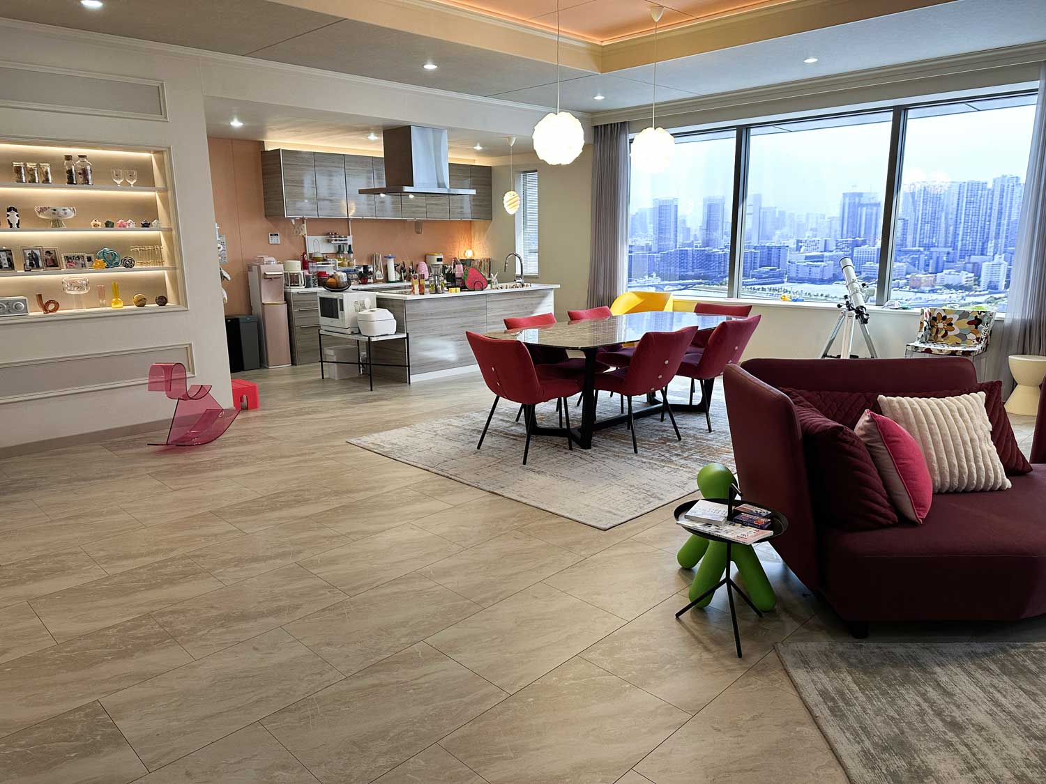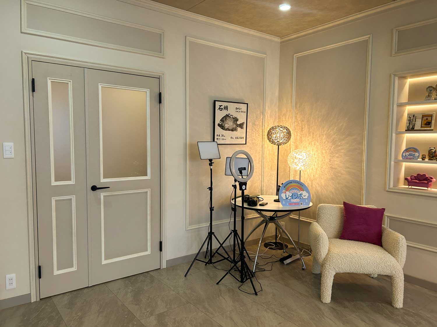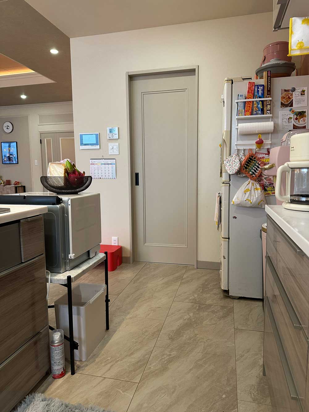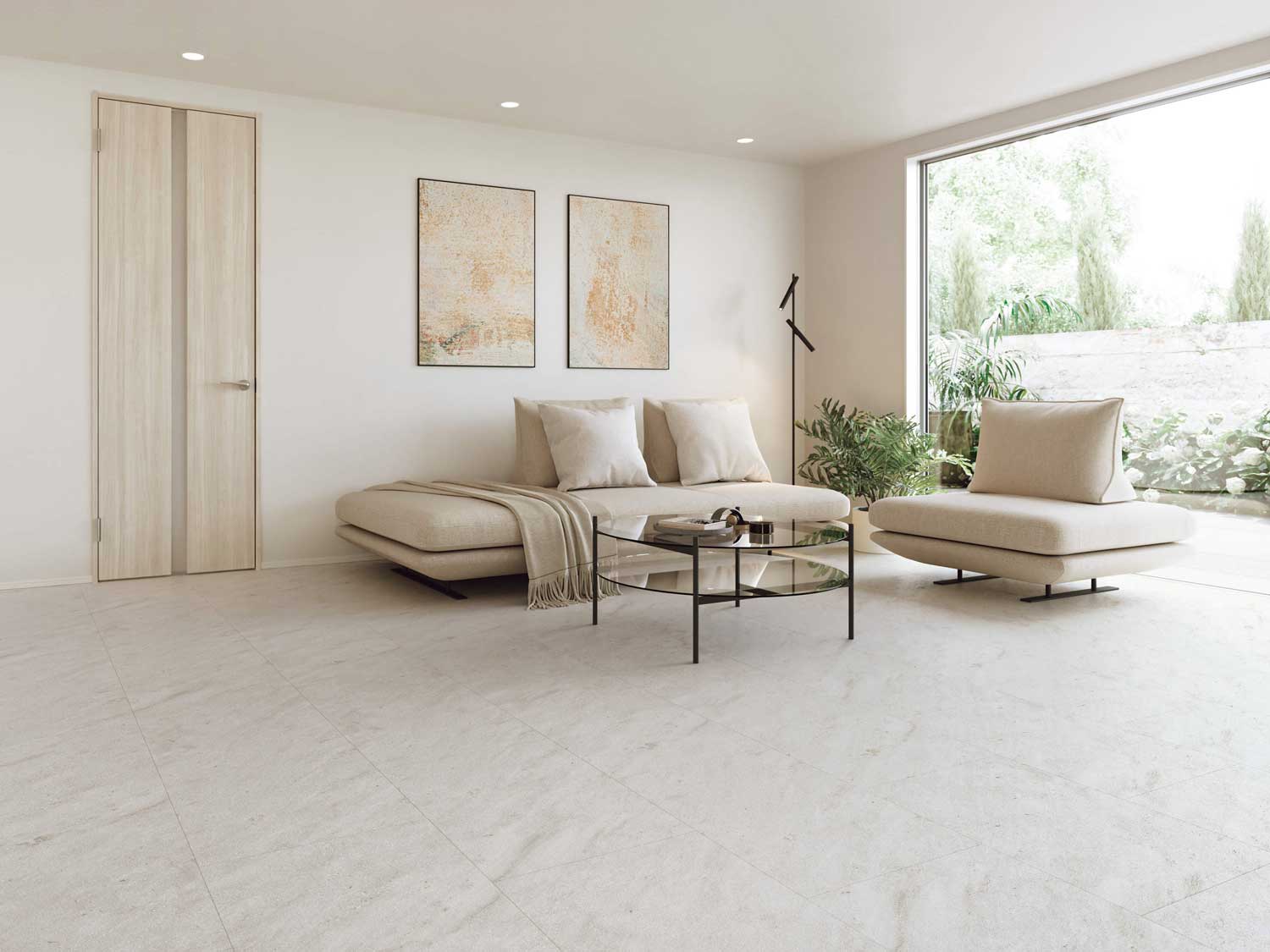 会社経営者の母親と6歳の娘が住む高級マンションのセットに、当社の非木質意匠フローリング「コンカーボ ベージュマーブル柄」と室内ドア・クロゼット「スキスムT ノーブルベージュ柄」が採用されました。やわらかなベージュ柄が、ヨーロピアンで上品かつ個性的な空間を演出しています。