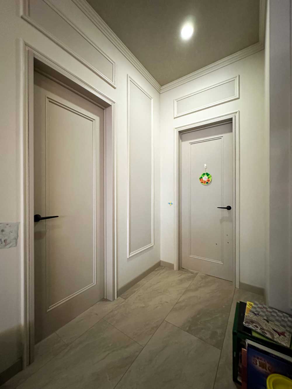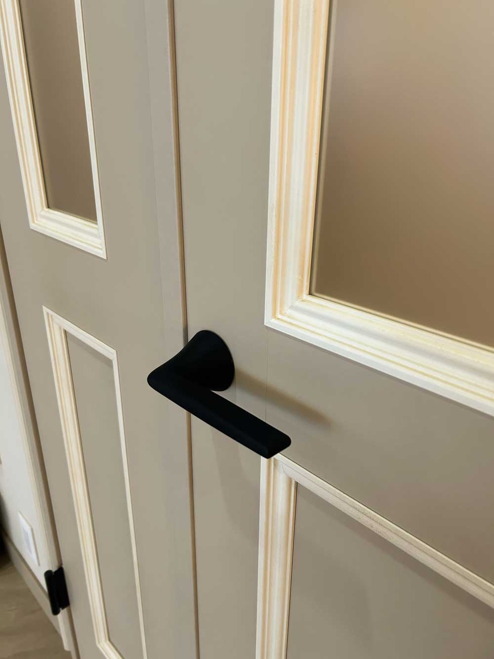 モールディングを施した壁との統一感を保ちながら、親子ドアの色柄とデザインが上質なアクセントを添えています。