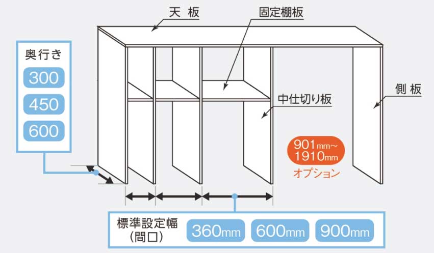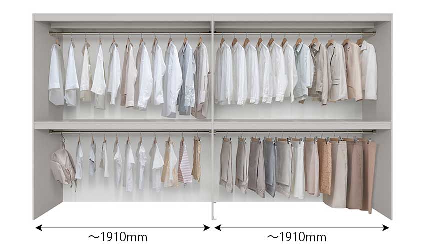 補強桟の追加により、耐荷重を変えずに、中仕切り板なしで天板・固定棚板・パイプを幅1910mmまで対応できます。すっきりとした見た目で収納量も増加します。