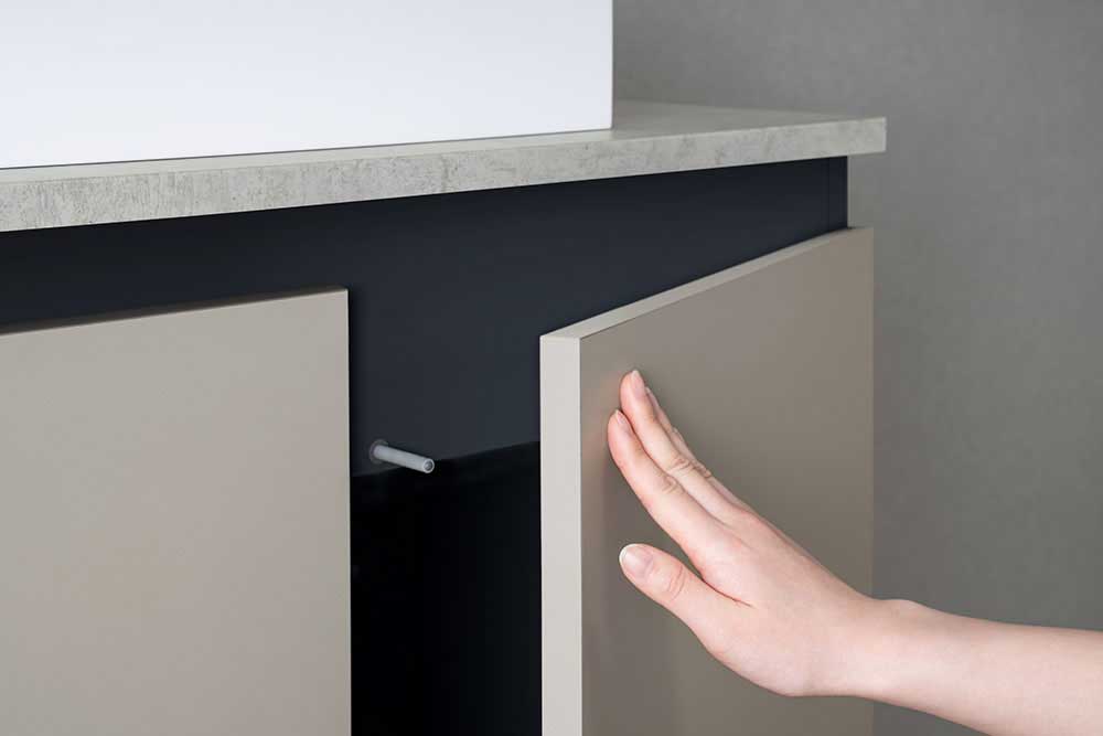 「アクアージュsai (コンパクトタイプ)」はプッシュオープン式の開き扉キャビネットを採用しました。