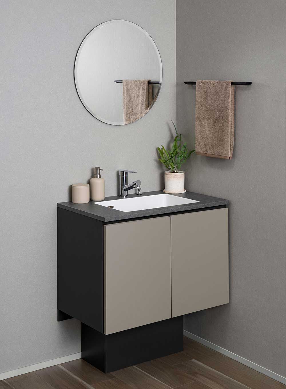 このたび新たに『コンパクトタイプ』を追加し、お客様のニーズにさらにお応えすることが可能になりました。従来のフロートスタイルの造作風デザインはそのまま、奥行きわずか450mmの狭い空間にも収まるサイズで、玄関横や通路、階段横などの限られたスペースでも快適に使えるコンパクトな設計です。来客や帰宅時の手洗いの用途など、2台目の洗面としてもおすすめです。