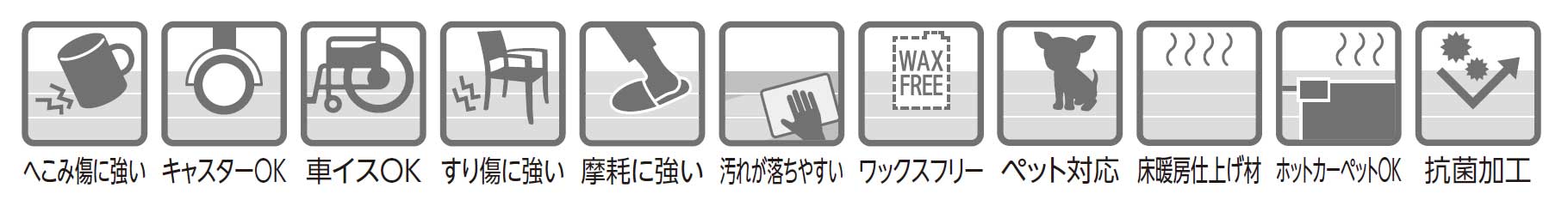 床暖房仕上げ材、ホットカーペット対応です。耐へこみ性能や耐傷性能など、従来のフロアに求められる性能を満たします。さらにペット対応の性能も備わっています。