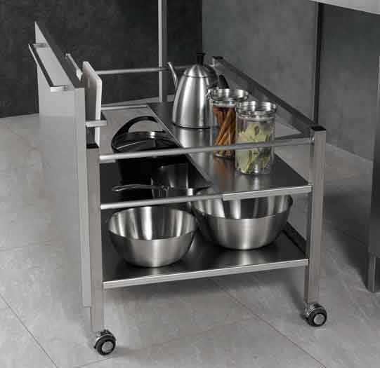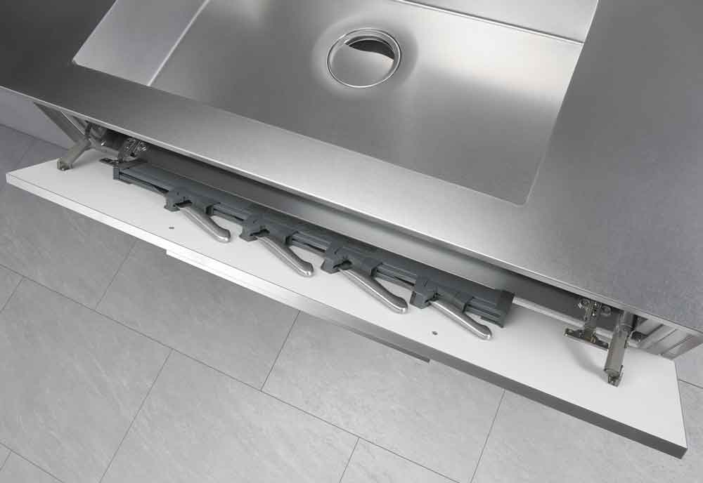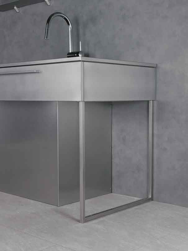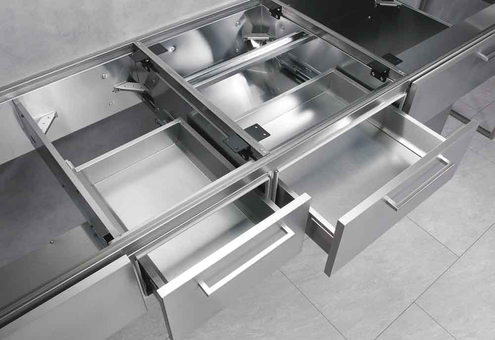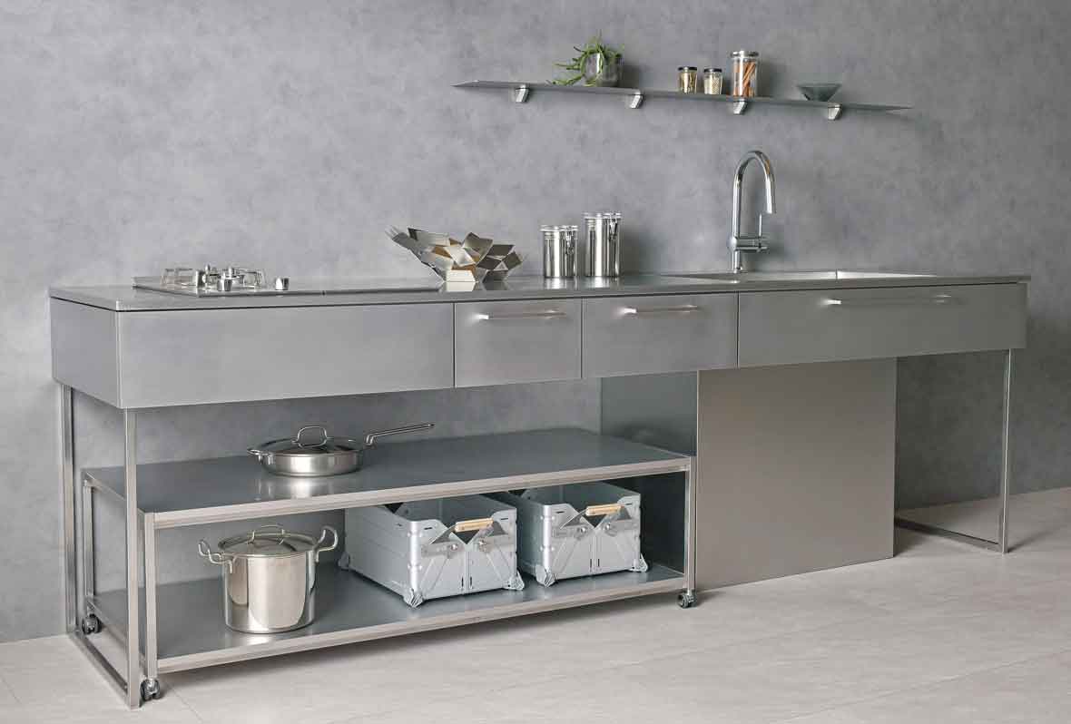 ②キャビネットには熱や汚れに強いステンレス材を採用。シンプルさの中にも機能性を確保するため作業面下の1段引出しやシンク前の包丁差しを設けました。