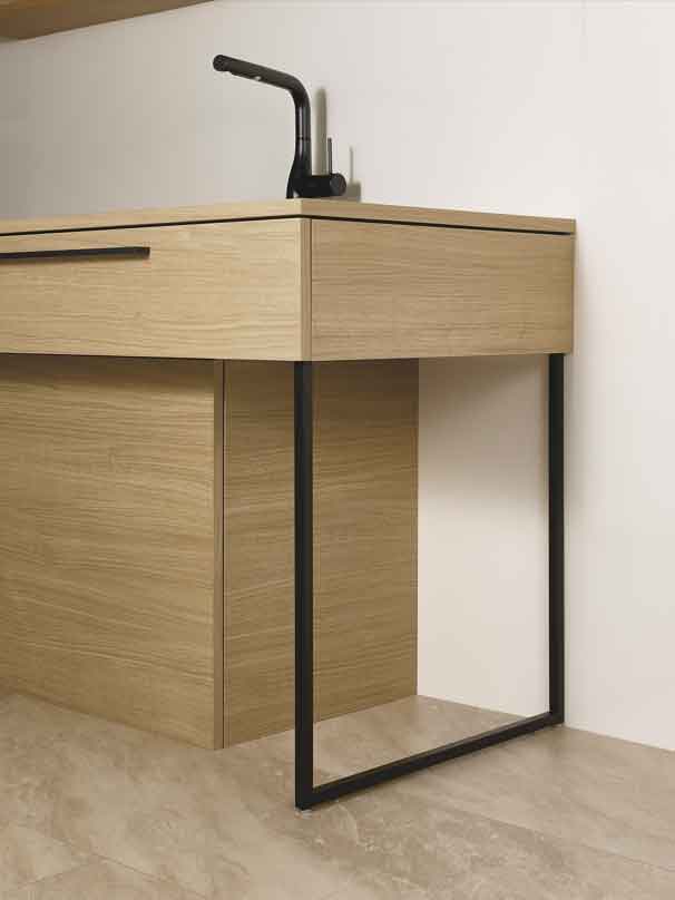 ①ワークトップとフレームの見付面を約20mmに揃えることで、 シンプルで調和のとれたデザインを実現。最小限のフレーム構成により、キッチン下にワイドなオープン空間を確保しました。