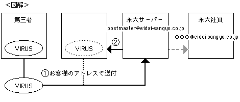 「お客様の身に覚えのない“ウィルス告知メール”」は、ウィルスがお客様の名前を偽り、弊社社員宛(○○○@eidai-sangyo.co.jp)にメールが送付されたため発生します。弊社(postmaster@eidai-sangyo.co.jp)ではウィルスに感染したメールを受信した際、ウィルスを駆除した上で“ウィルス告知メール”を送信しております。