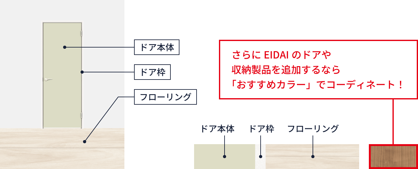 お好きなカラーをクリックすると、デコルシェのドアカラーに似合うドア枠、フローリングなど色の組み合わせを見ることができます。