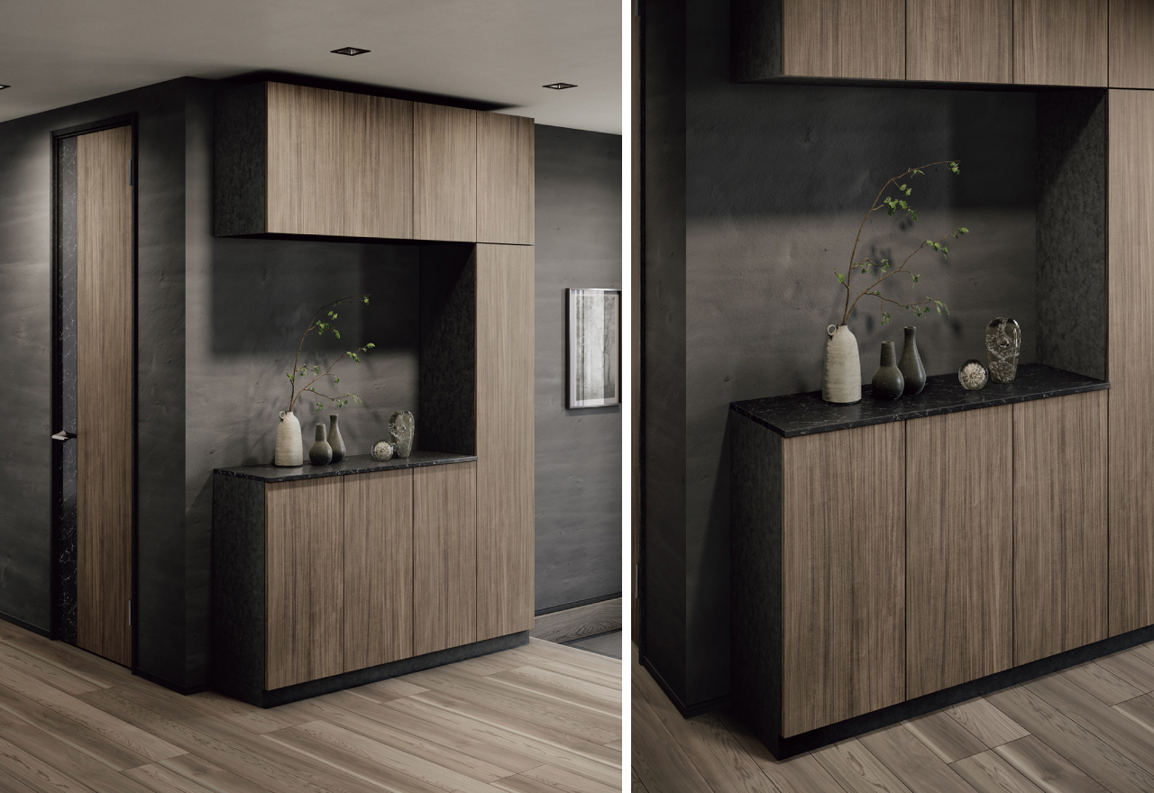 グレイッシュトーンの木目で穏やかさを保ちながら動きのある大理石模様をアクセントにすることで空間に品格が備わります。お気に入りのインテリアとうまく調和をしながら優美な表情を映し出します。